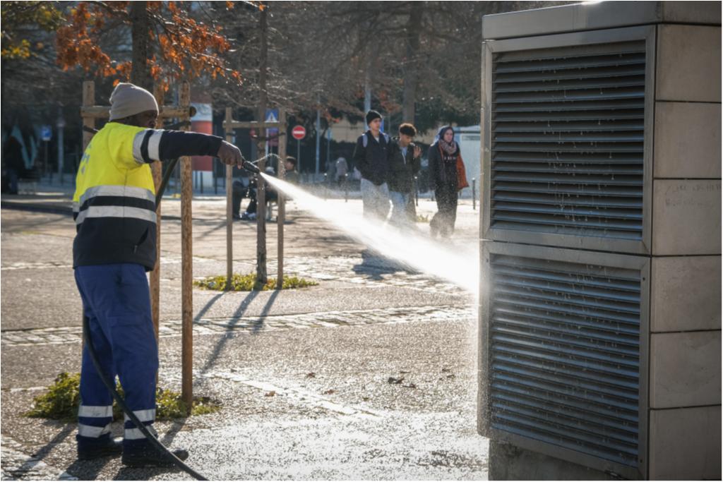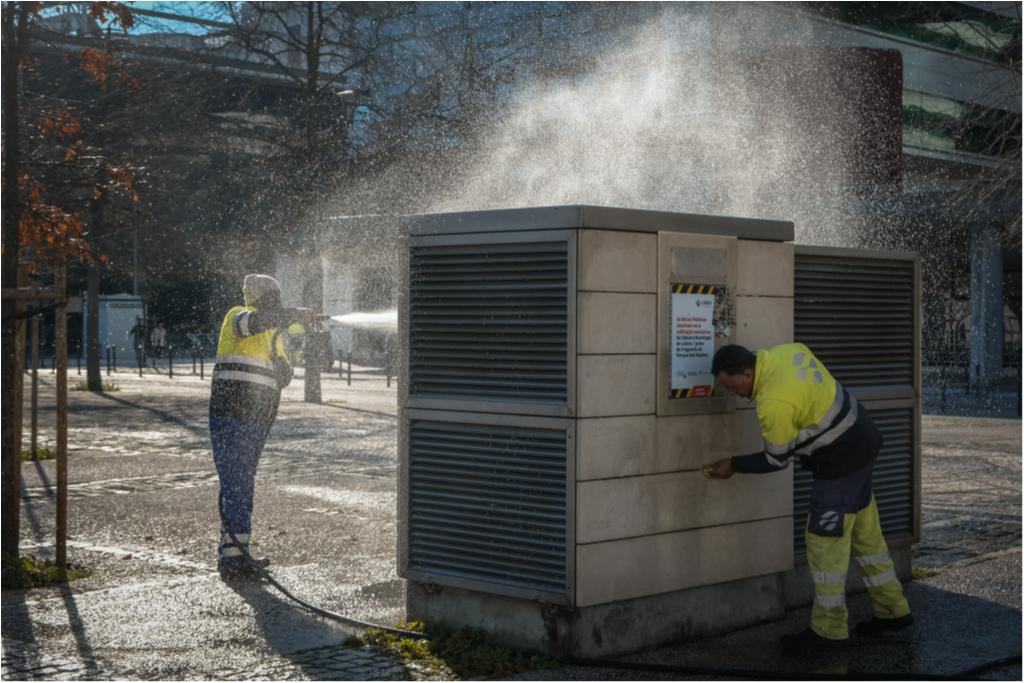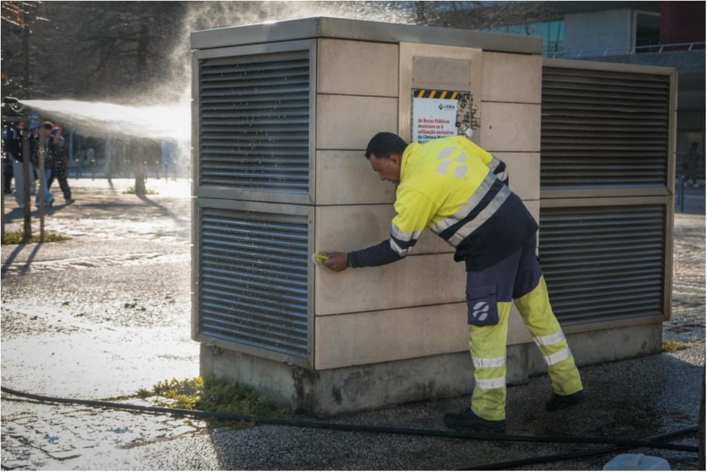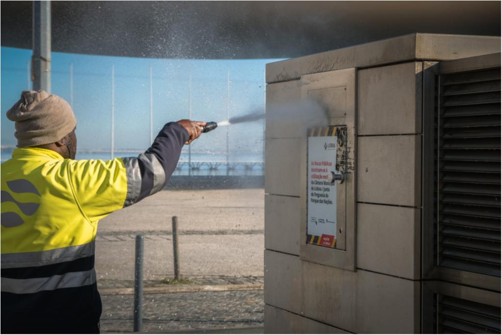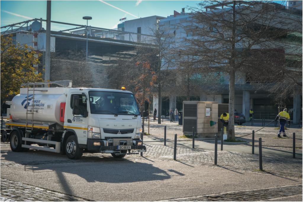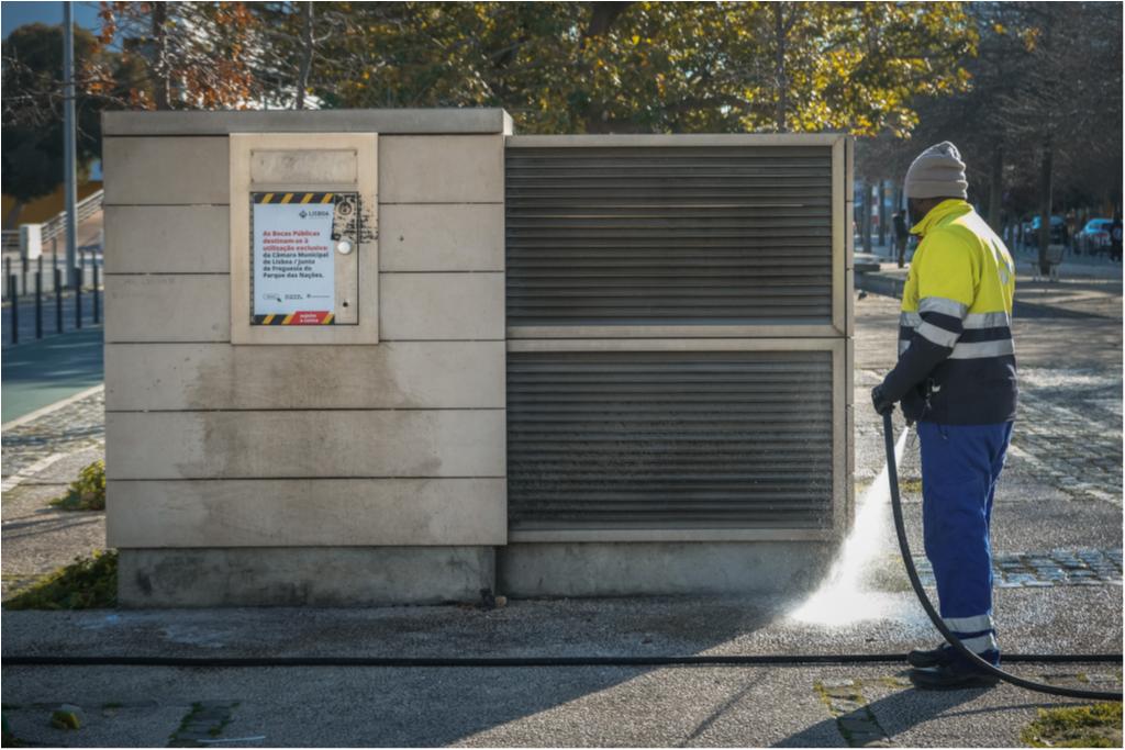 Hoje destacamos trabalhos de limpeza com lavadora das paredes exteriores e pala do Pavilhão de Portugal, dos depósitos das condutas de lixo da Alameda dos Oceanos, vidrões do Passeio do Báltico e do Passeio do Cantábrico, Pavimento do Rossio dos Olivais e ainda dos contentores e vidrões da Rua do Bojador.