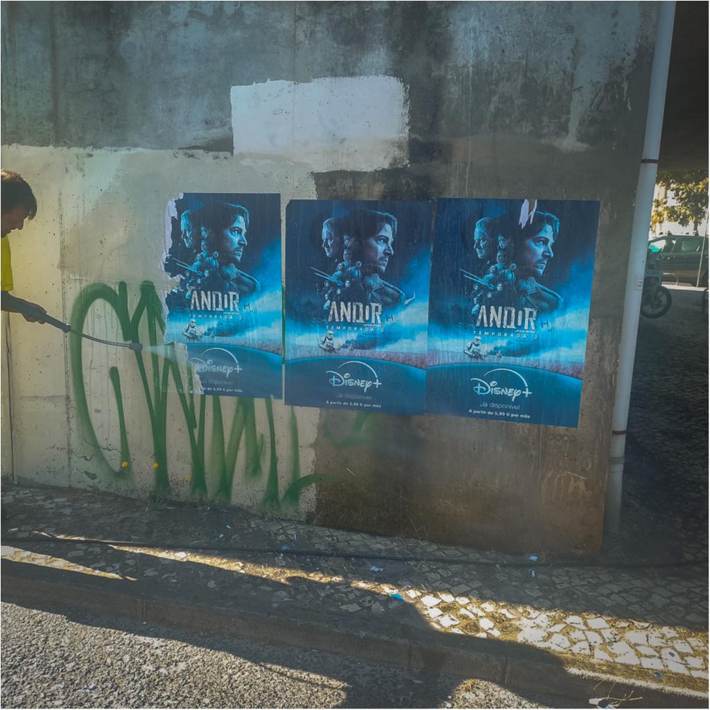 Hoje destacamos a remoção de cartazes do viaduto da Rua João Pinto Ribeiro, com recurso a mangueira a jato de água, de uma das varredoras ao serviço da JFPN.