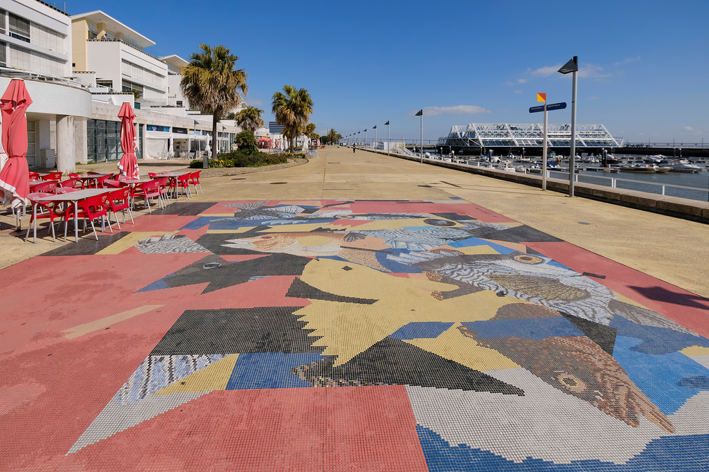 Os peixes são o motivo desta obra em mosaico italiano. Uns motivos são representados inteiros, como se tivessem sido digitalizados, outros fragmentados e planos, como numa colagem.