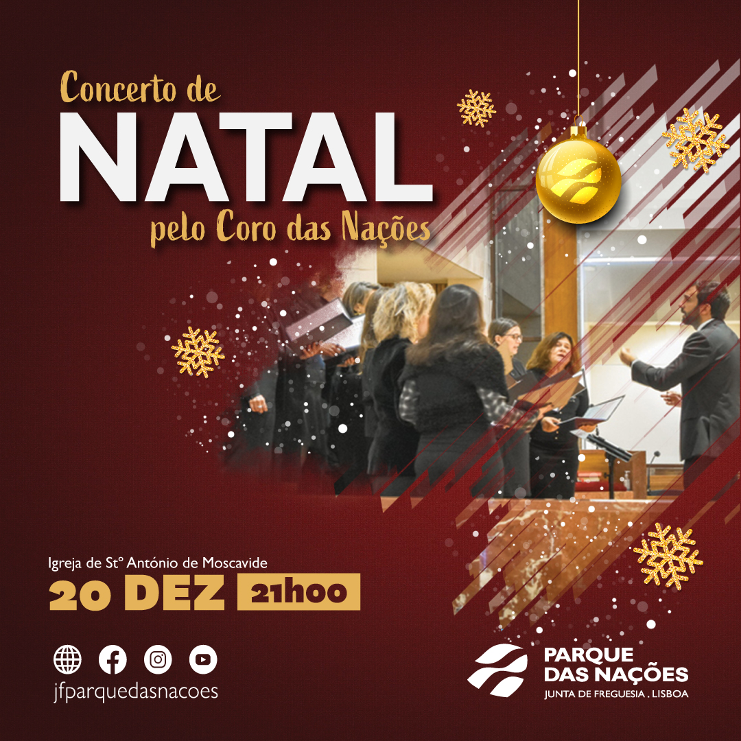 O Coro das Nações fará duas apresentações do habitual Concerto de Natal: a primeira a 20 de dezembro, na Igreja de Stº António de Moscavide, às 21h e dia 22, na Igreja Nossa Sra. dos Navegantes, às 18h30.